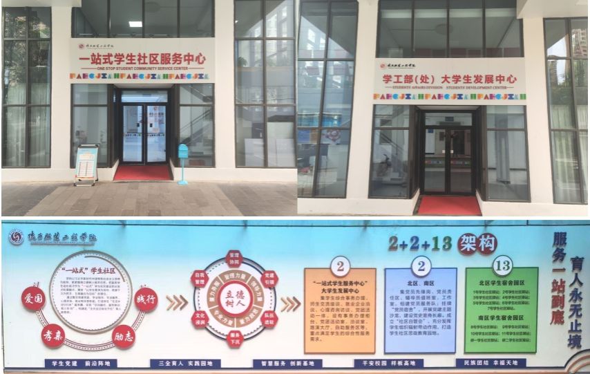 自开展“一站式”学生社区建设试点工作以来,学校深入学习贯彻习近平总书记关于教育的重要论述,全面落实立德树人根本任务,构建了“12345”工作布局:“筑牢一个核心(党建引领)、畅通两条路径(线下办事大厅、线上学工系统平台)、深化三全育人(全员、全过程、全方位)、集聚四种力量(领导力量、管理力量、服务力量、思政力量)、实现五育并举(德智体美劳)”,统筹调动各类教育教学主体、要素、环节和资源服务保障学生成长发展需求。学校逐步形成“1+2+13”的空间格局,即一个主体、两中心支撑、十三个驿站协同发力。