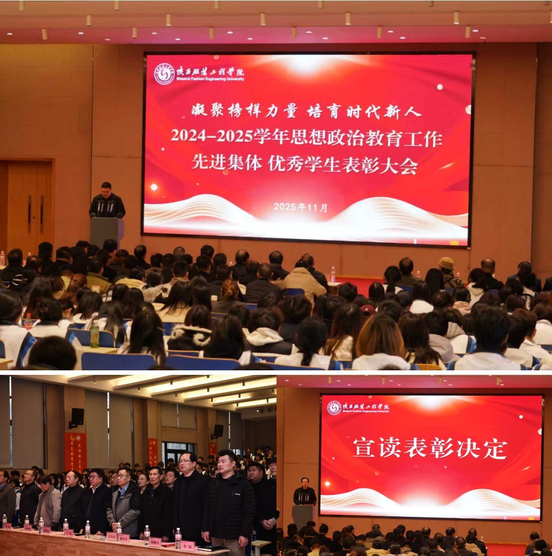 陕服新闻网讯(张维峰)11月26日,陕西服装工程学院“凝聚榜样力量 培育时代新人”2024-2025学年思想政治教育工作先进集体与优秀学生表彰大会在E1-4报告厅举行。校长姜寿山、党委书记王岗,及校领导黄新民、潘庆才、唐明晰、刘运、刘继兵、罗文谦、李钊等出席大会。各学院党政负责人、各职能部门负责同志、学工办主任、全体辅导员及学生代表参加,大会由学工部副部长董良超主持。